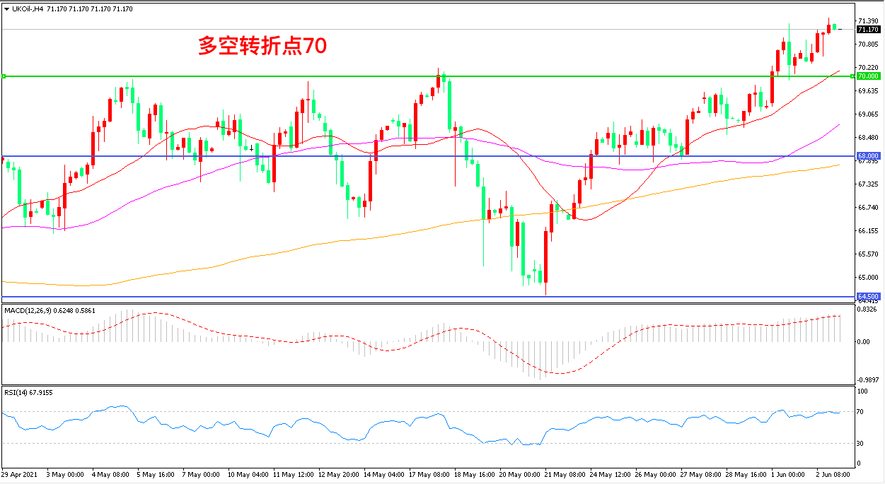 4小时图看,油价长阳拉升,突破前期整理区间,短期表现较为强势,21周期均线拐头向上,70美元成为下方支撑,MACD红柱增加,RSI指标走平,日内震荡上行概率较大。