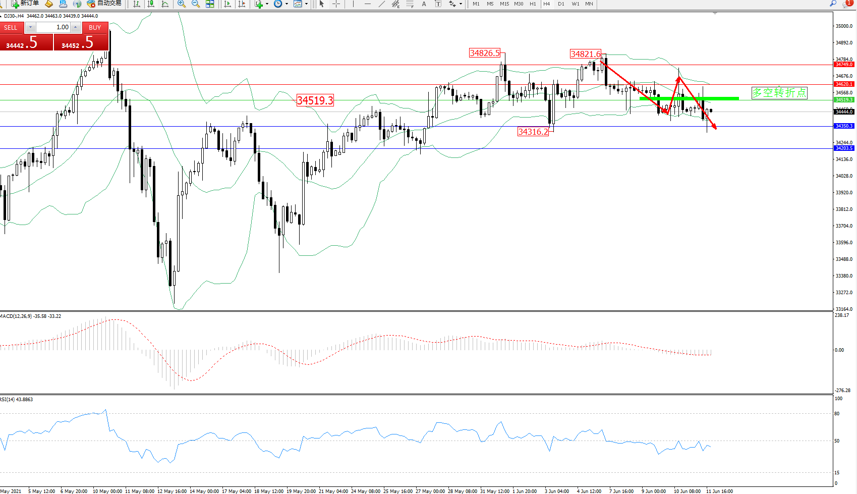 交易策略:34519下方看跌,目标34350、34203