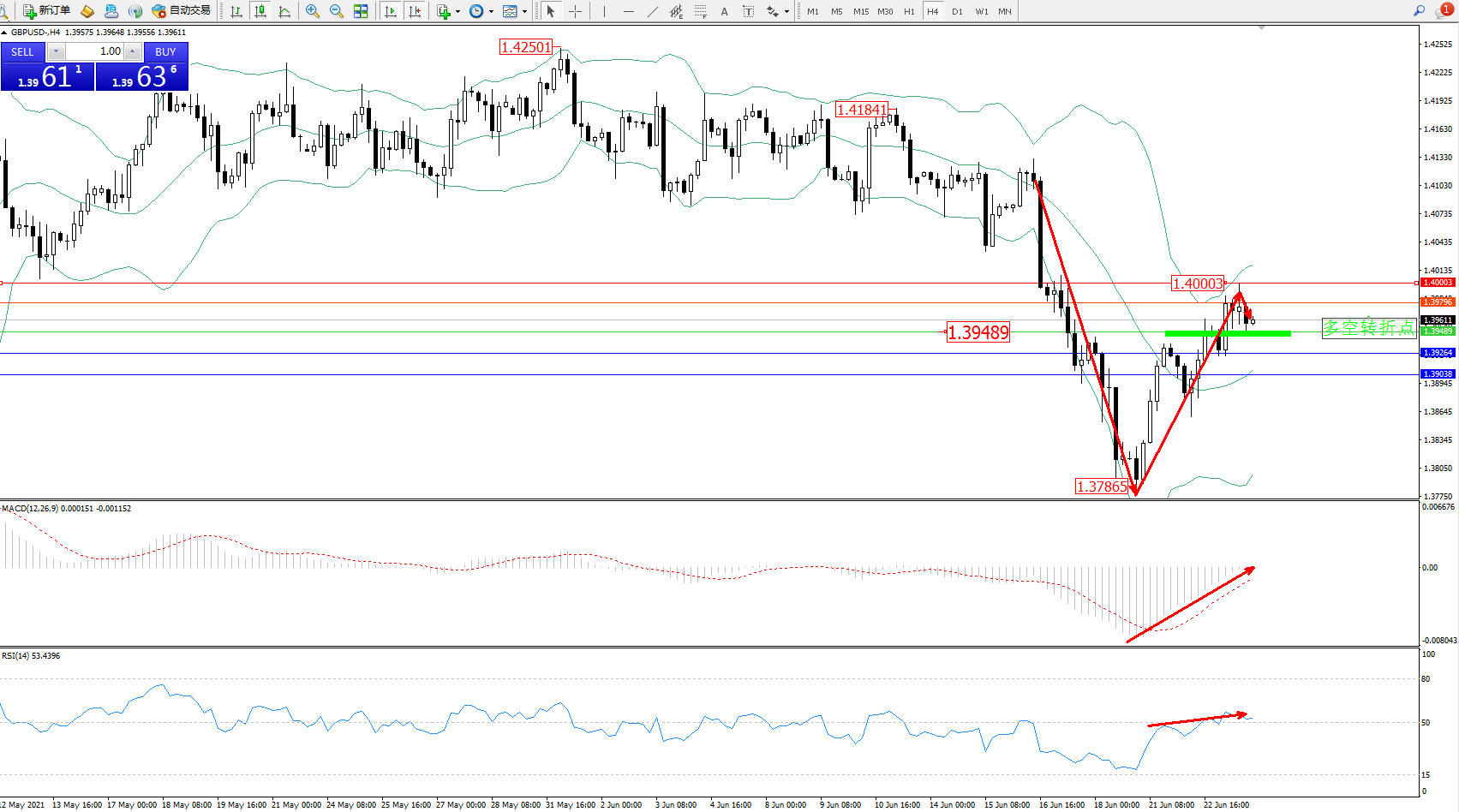 交易策略:1.39489上方看涨,目标1.39796、1.40003