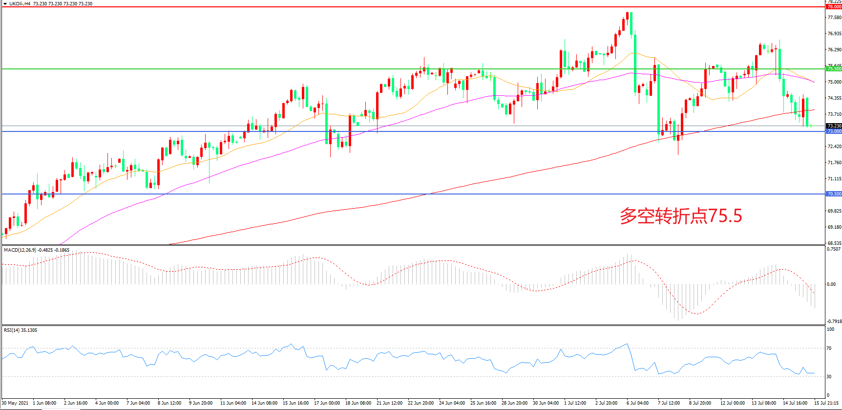 交易策略:在75.50之下看跌,目标73.00                70.50