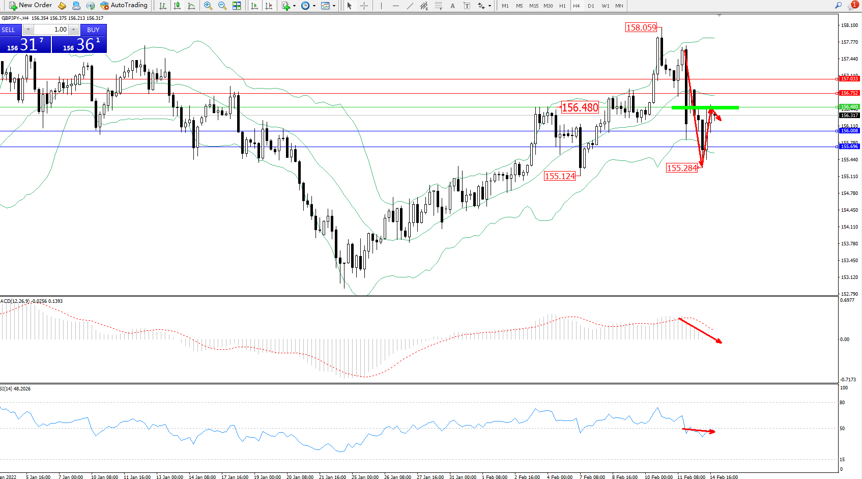 交易策略:156.480下方看跌,目标156.008、155.696