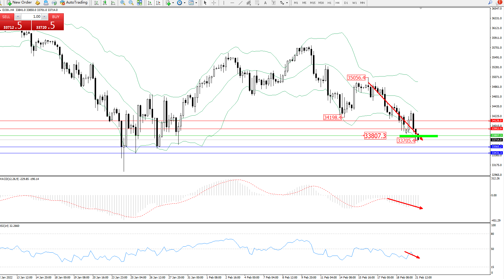 技术点评:空头动力延续布林带指标通道中下轨区间持续震荡下行,低位抵达33705附近开始支撑整理,短期下行趋势态势良好,布林带指标呈收口走势缓慢张口下行,MACD指标处于空头区域弱势整理下行,RSI指标处于空头区域窄幅整理平移中;