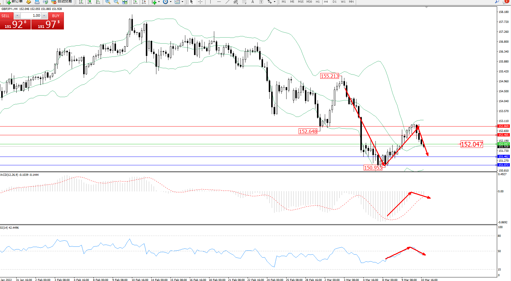 交易策略:152.047下方看跌,目标151.462、151.072