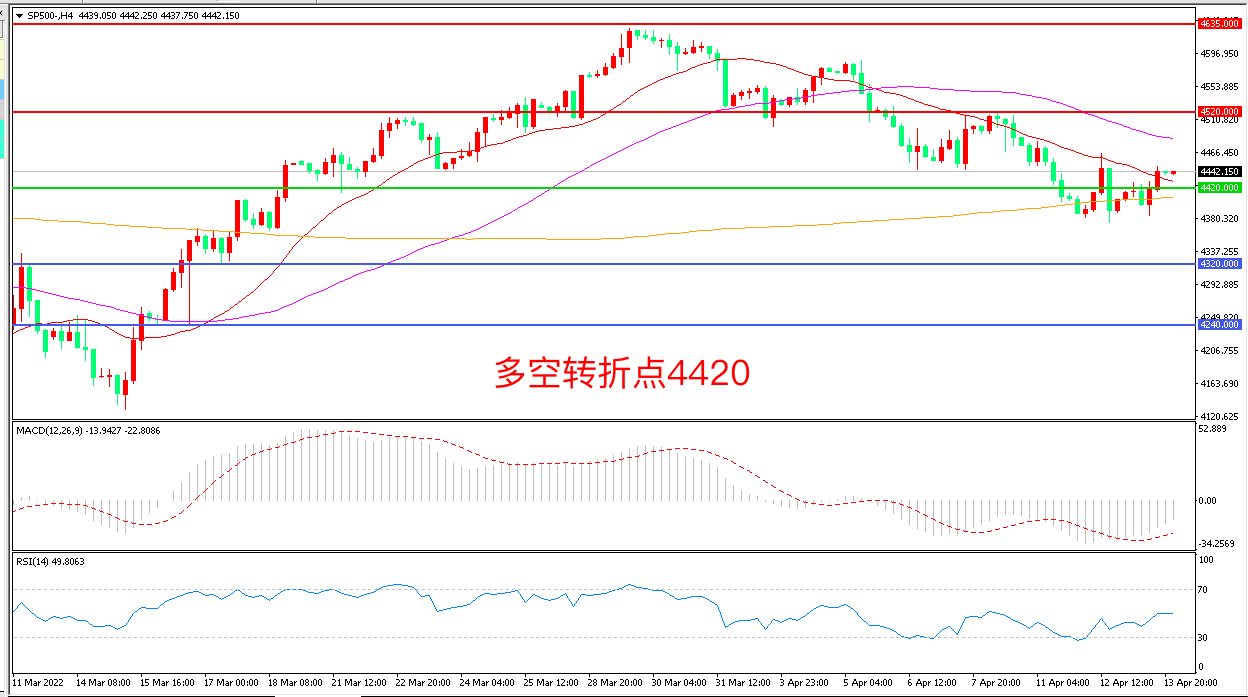 4小时图看,标普500以200周期均线为依托小幅反弹,横盘继续明显,4420成为多空分水岭,MACD绿柱缩短,RSI指标走平,日内延续震荡概率较大。