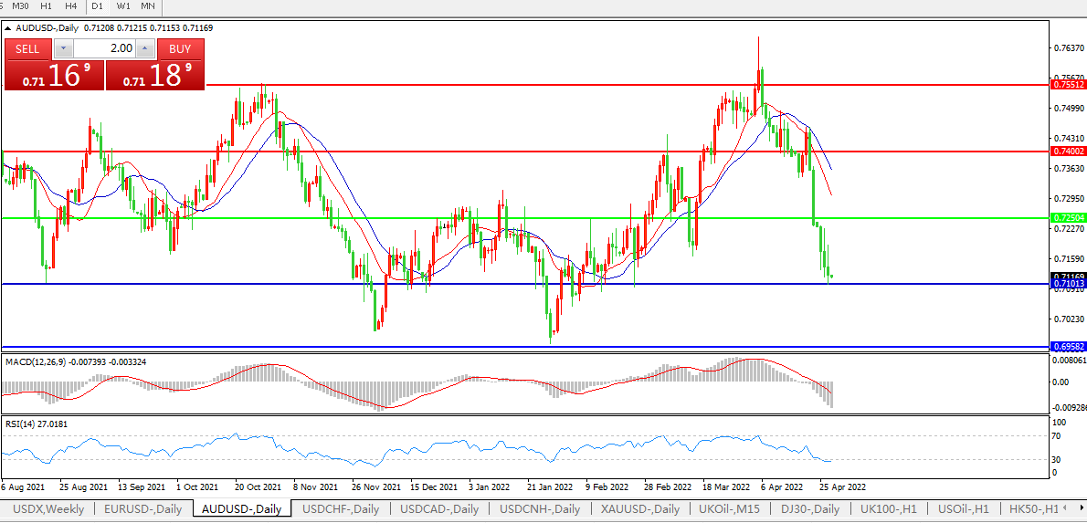 澳元兑美元触及2月以来最低,但随后数据显示澳洲第一季消费者物价创20年来最大同比涨幅,激发对澳洲联储最快可能下周加息的臆测,这推动澳元脱离低位。澳元兑美元尾盘涨0.03%,报0.7124美元。