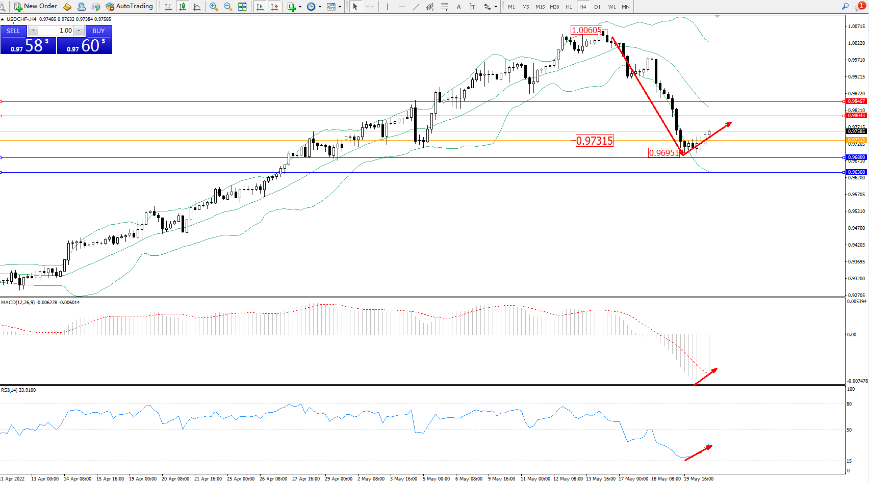 交易策略:0.97315上方看涨,目标0.98043、0.98467