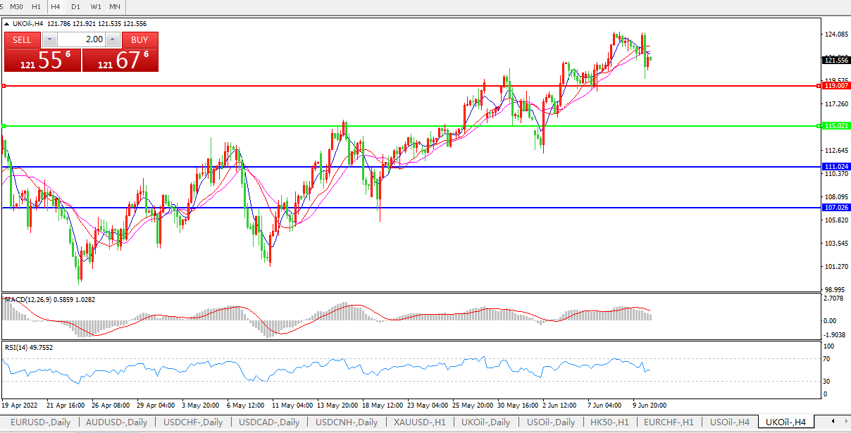 技术面简析:4小时图看,油价高位盘整,短线稍显弱势, MACD量能柱缩短,RSI指标走弱,日内继续走弱概率较大。