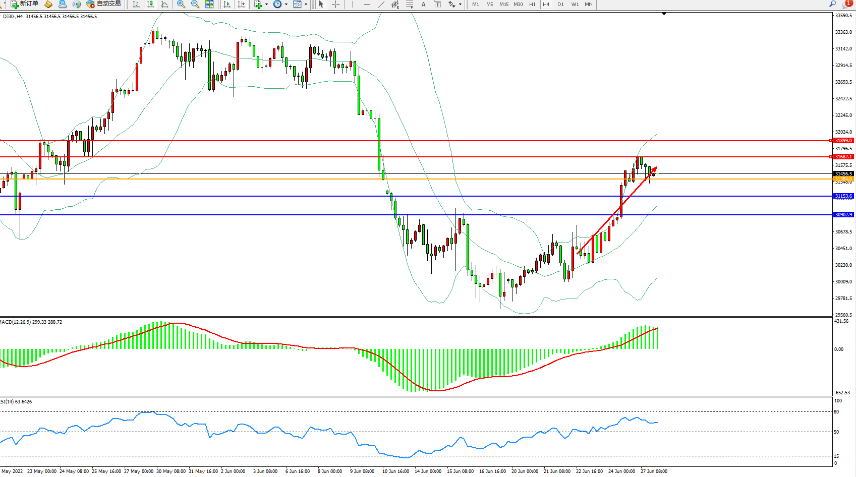 道琼斯指数DJ30——4小时K线图显示: