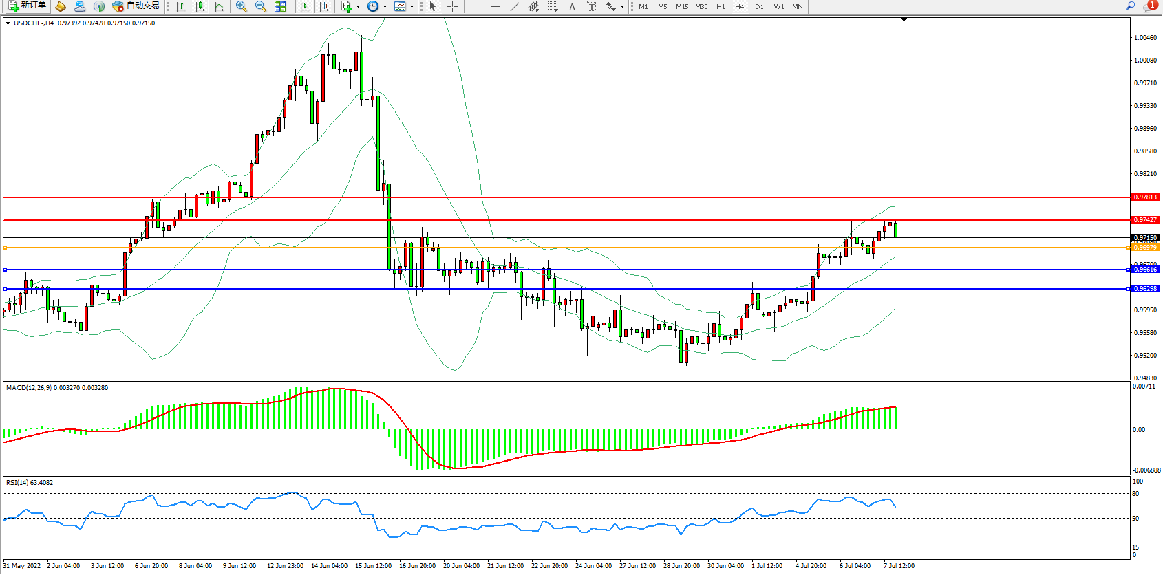 交易策略:0.96979上方看涨,目标0.97427、0.97813