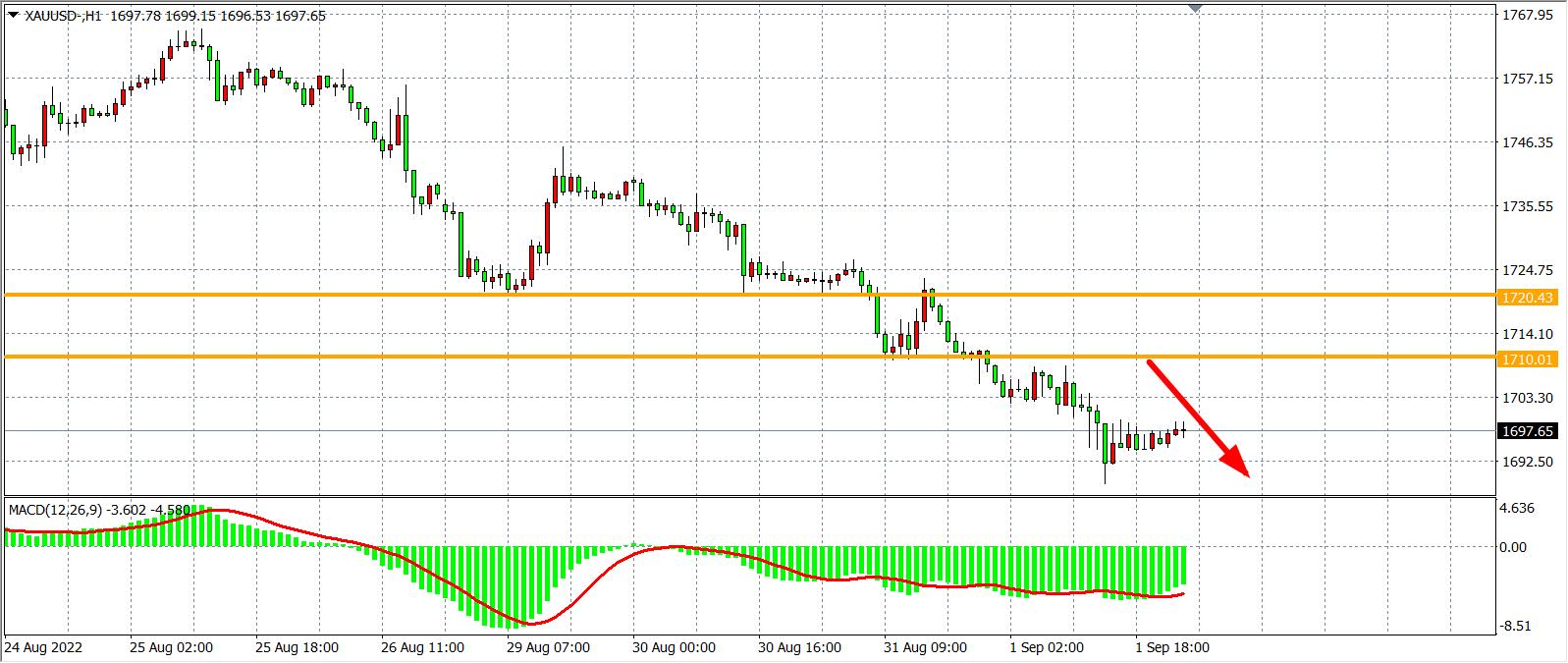 1小时图看,金价跌势扩大,跌破1700美元关口,趋势延续空头,MACD于零轴之下持续放量,显示下降趋势有所延续,目前阻力仍集中在1710一线,在1710之下看1680-1660。