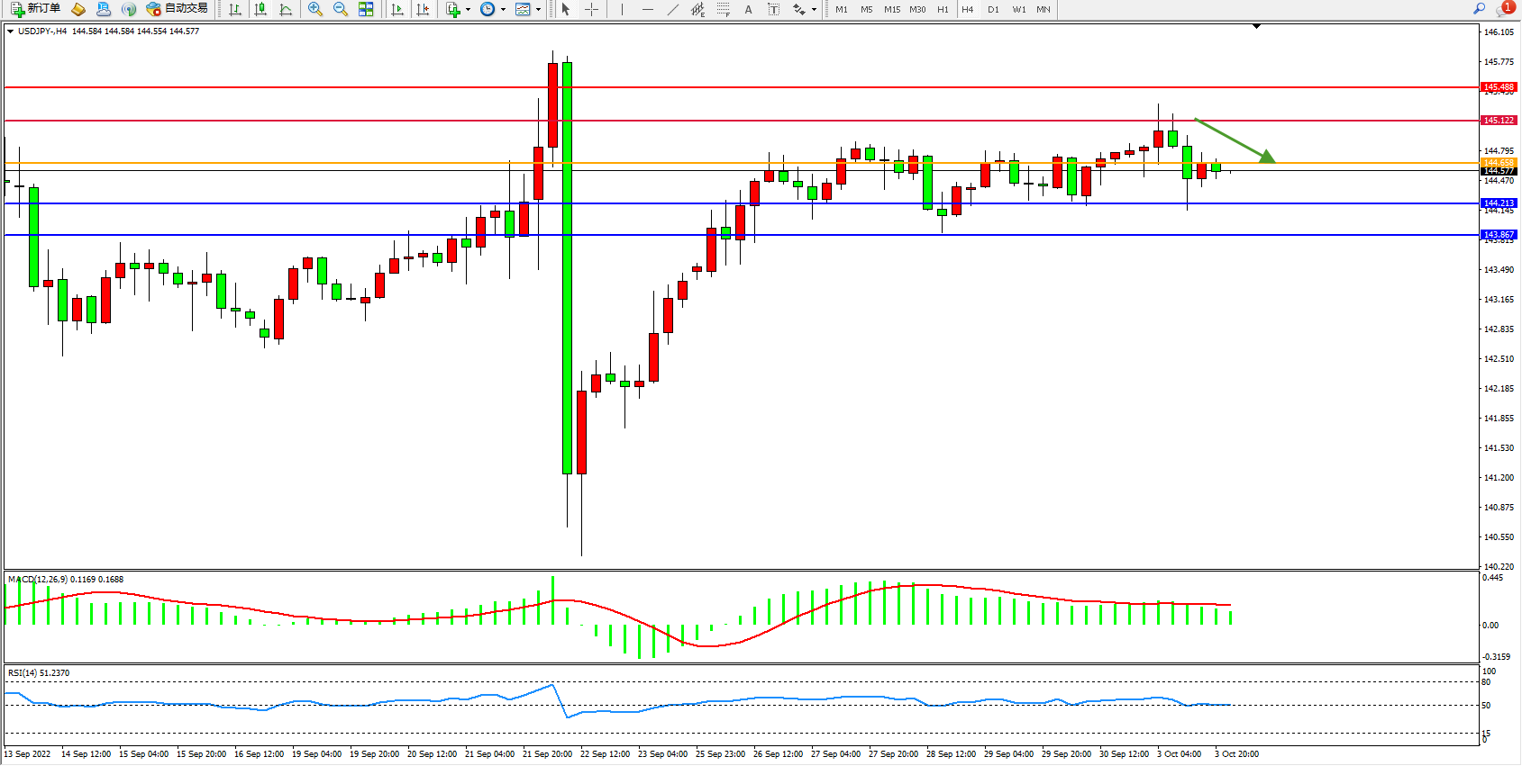 交易策略:144.648下方看跌,目标144.213、143.867