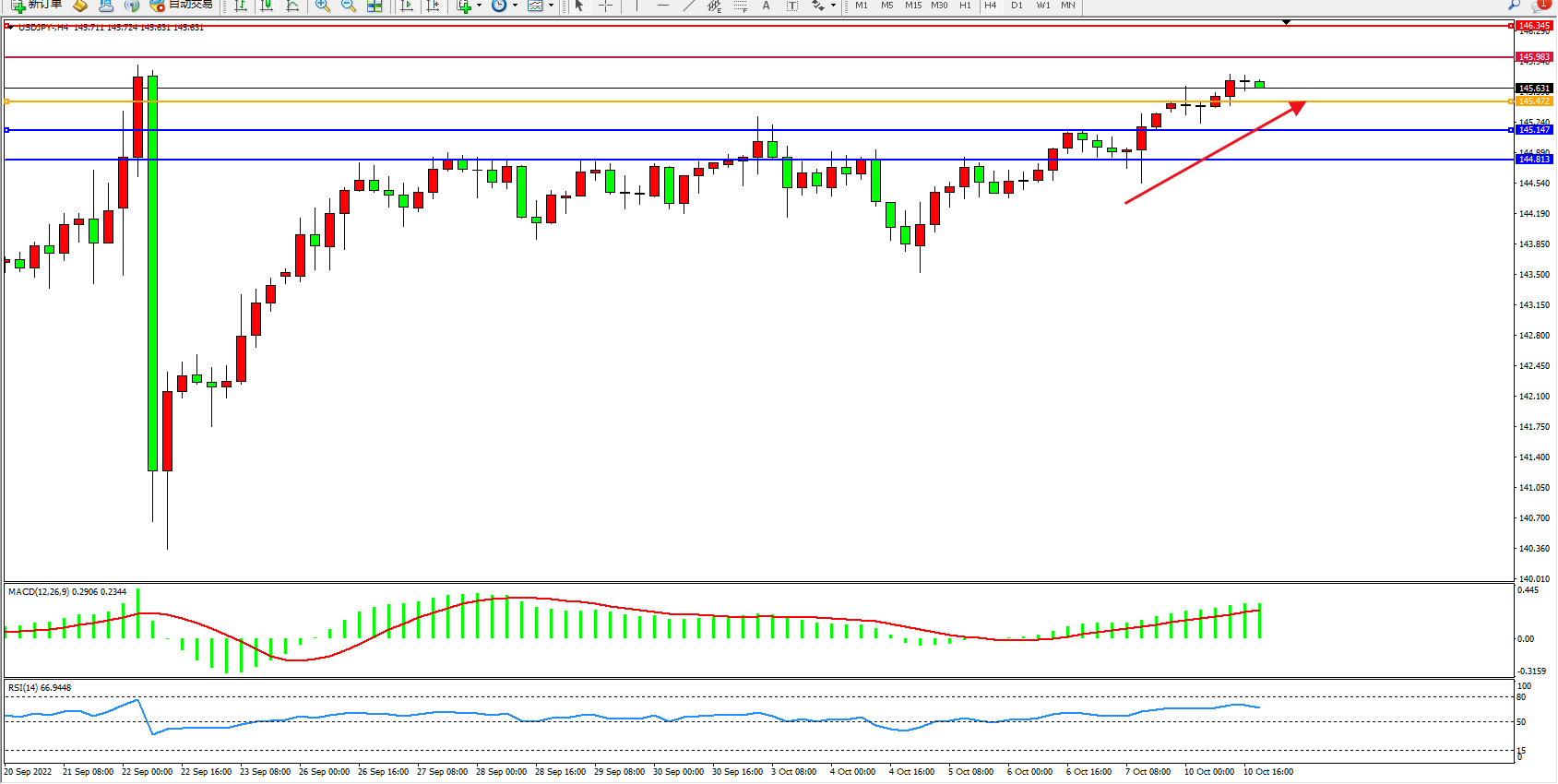 美元日圆USDJPY——4小时K线图显示: