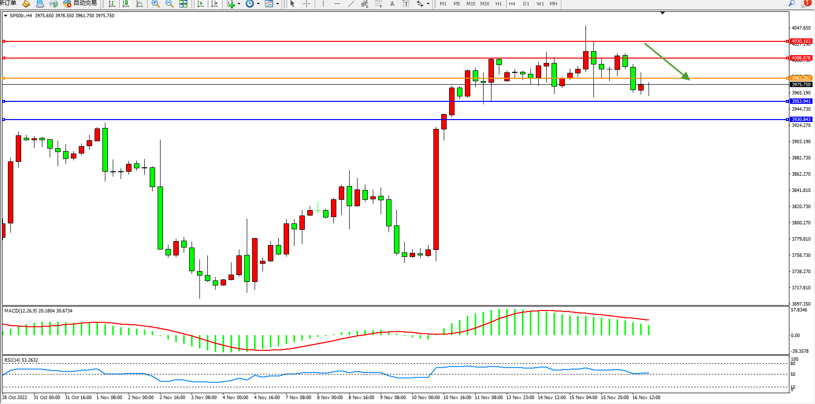 标普500指数11月16日(周三)收盘下跌31.93点,跌幅0.80%,报3959.80点;新冠疫情大流行期间积累的大量储蓄,以及在劳动力市场吃紧的情况下工资的强劲增长,总体上帮助消费者经受住了价格上涨和借贷成本上升的考验。由于收紧的货币政策抑制了整体需求,给劳动力市场和经济带来压力,预计这种支撑将在明年消退。