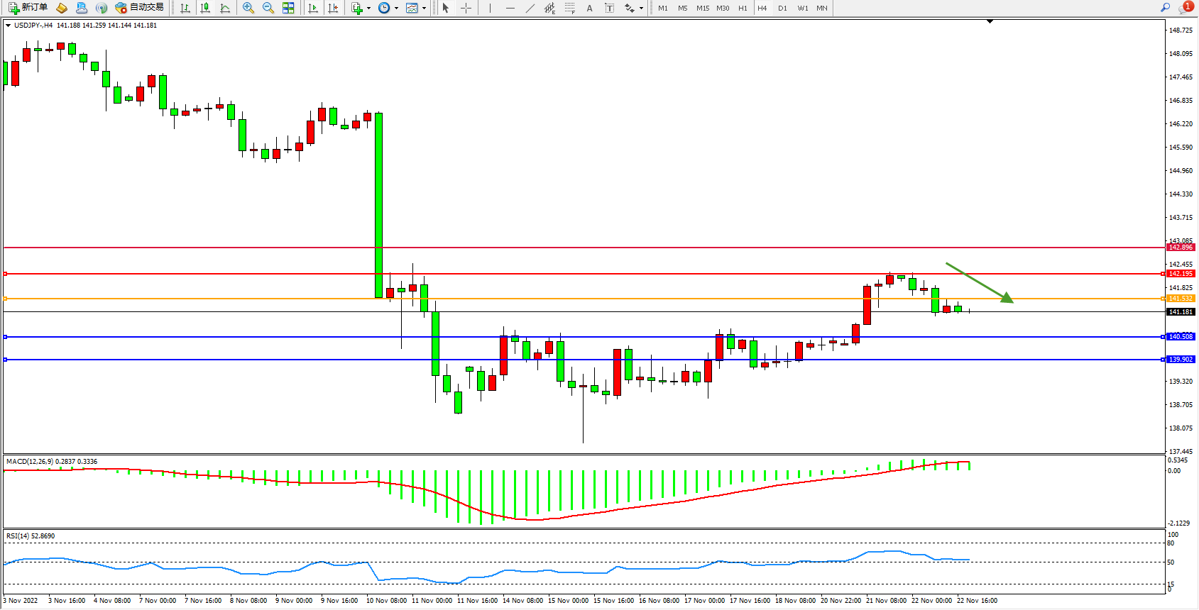 交易策略:141.532下方看跌,目标140.508、139.902
