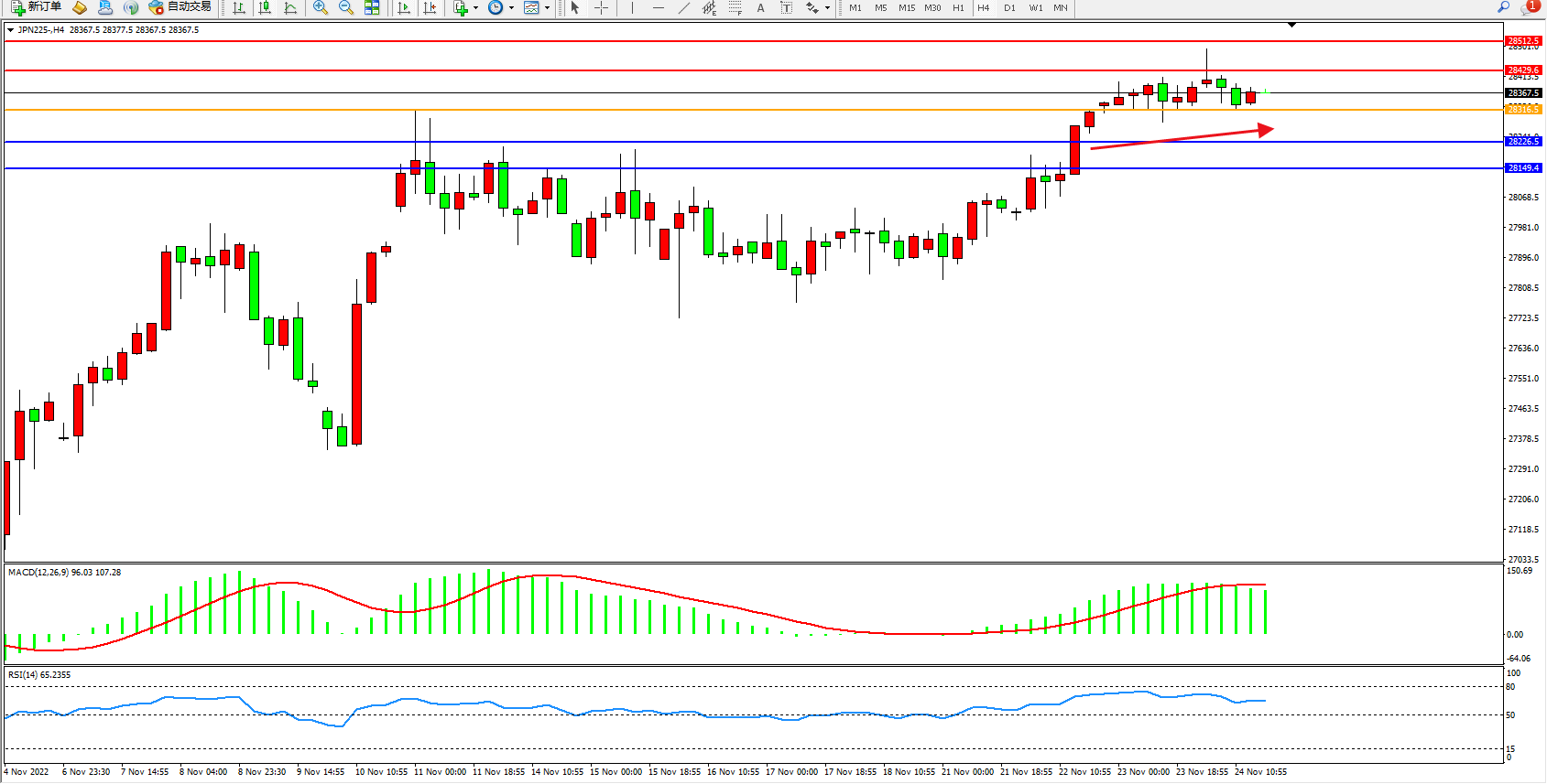 道琼斯指数DJ30——4小时K线图显示: