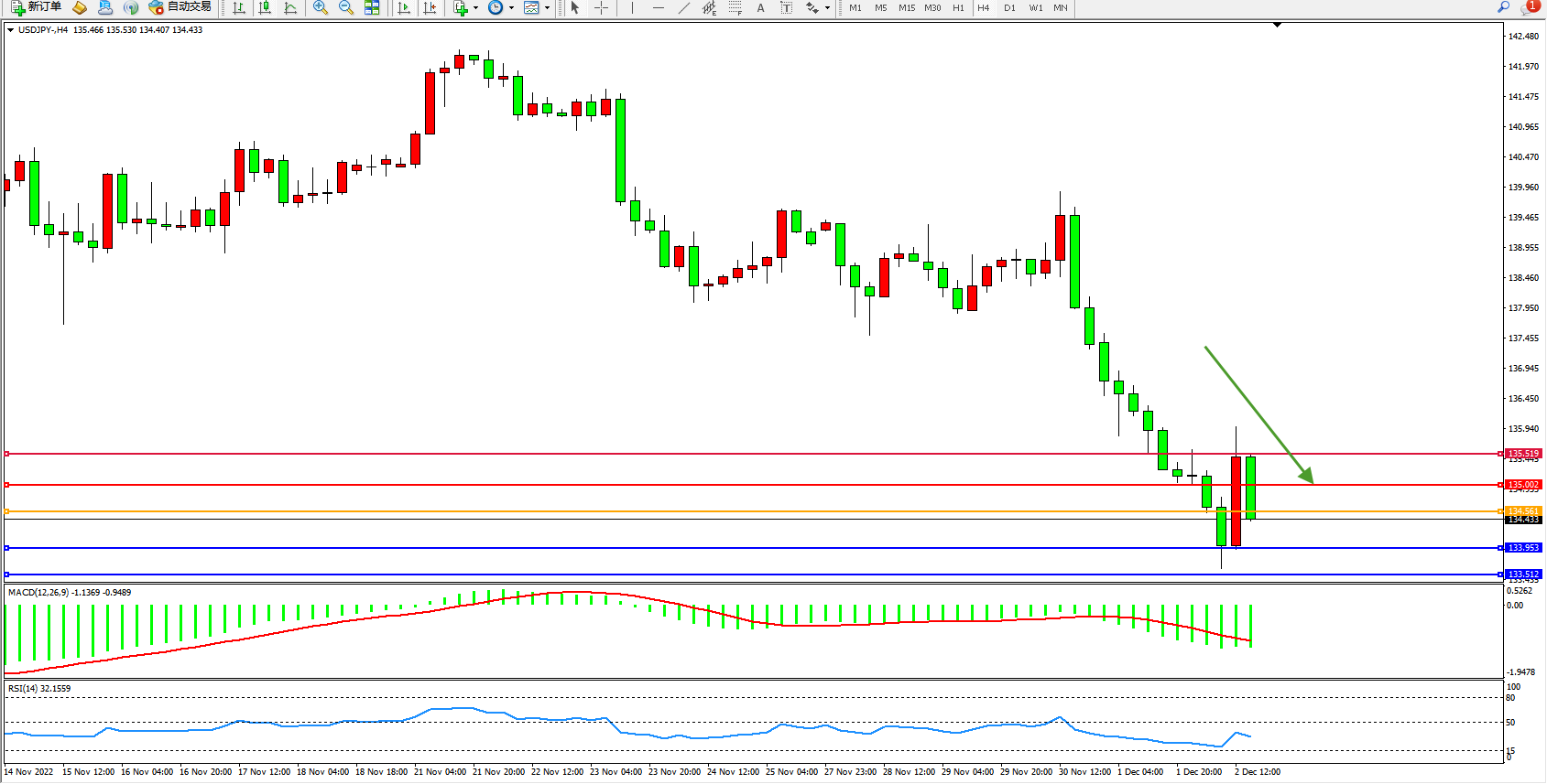 交易策略:134.561下方看跌,目标133.953、133.512
