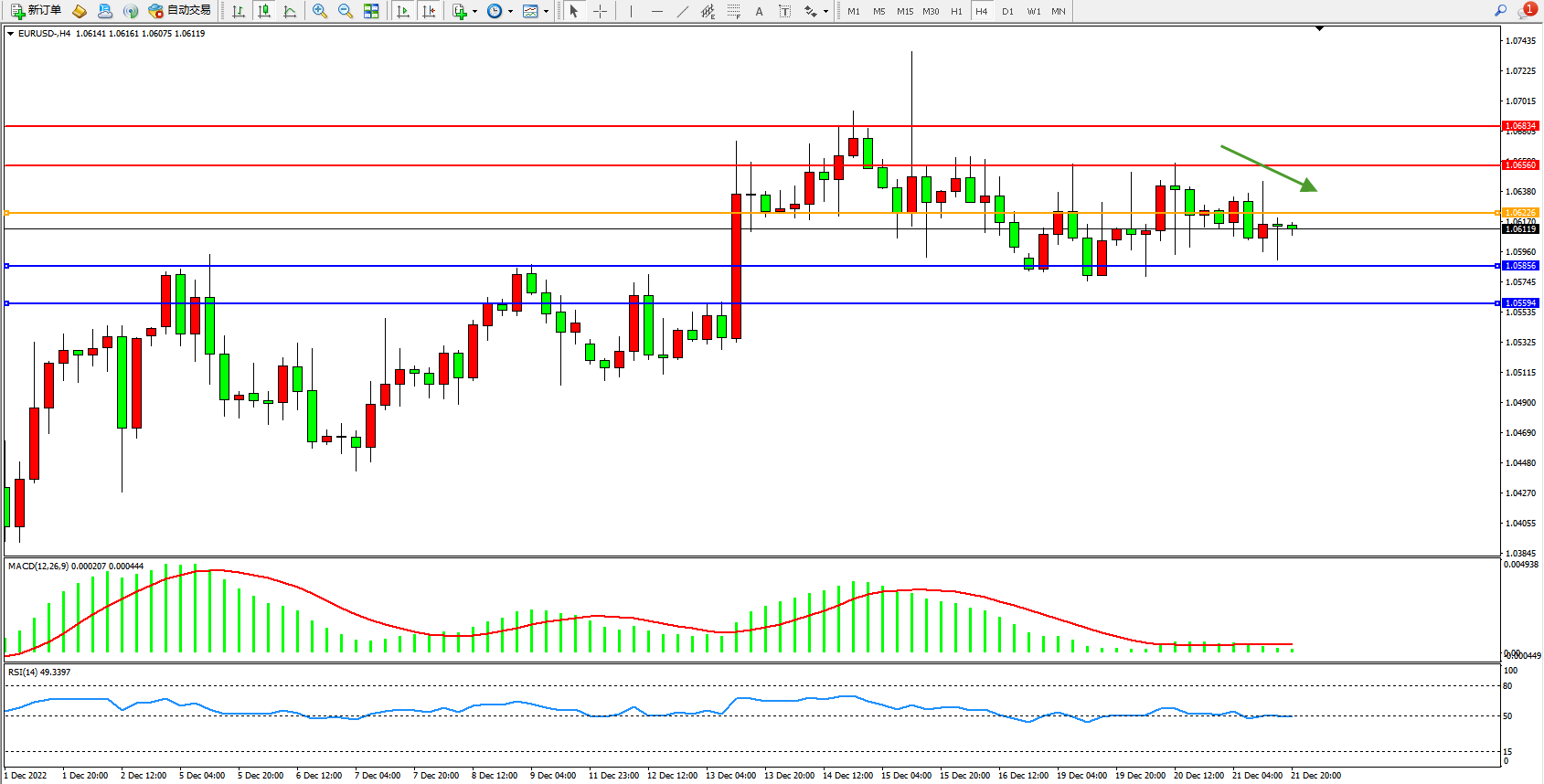 4小时图看:高位宽幅震荡整理,市场空头动力维持弱势,短期依旧有缓慢下行走势迹象,MACD指标处于0轴线上側弱势徘徊,RSI指标处于50均衡线附近弱势整理;