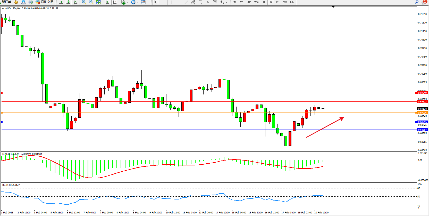 交易策略:0.69036上方看涨,目标0.69323、0.69549