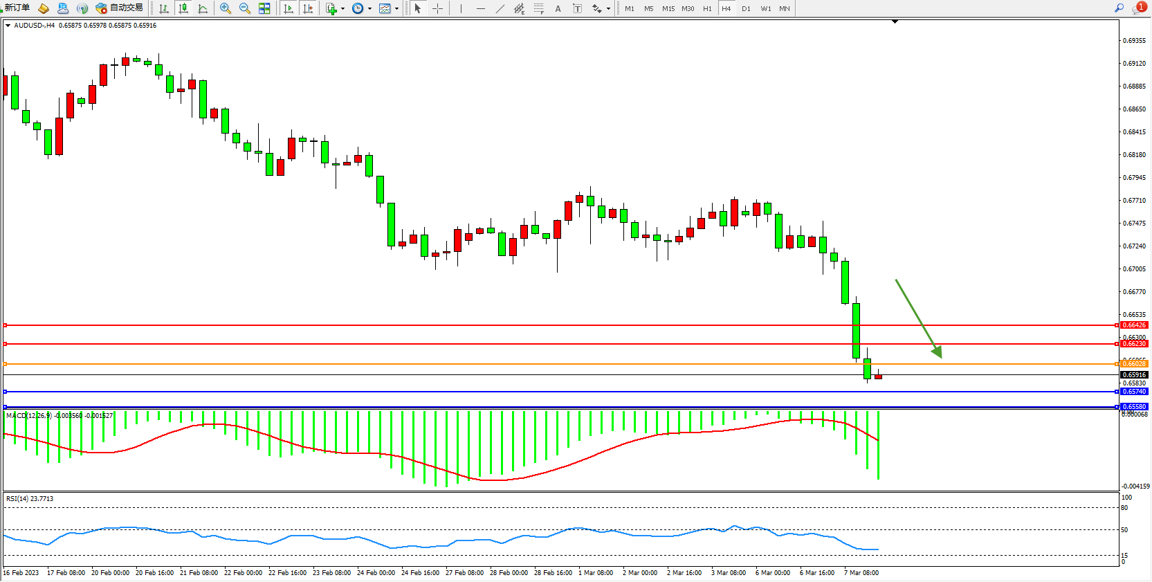 交易策略:0.66028下方看跌,目标0.65740  0.65580