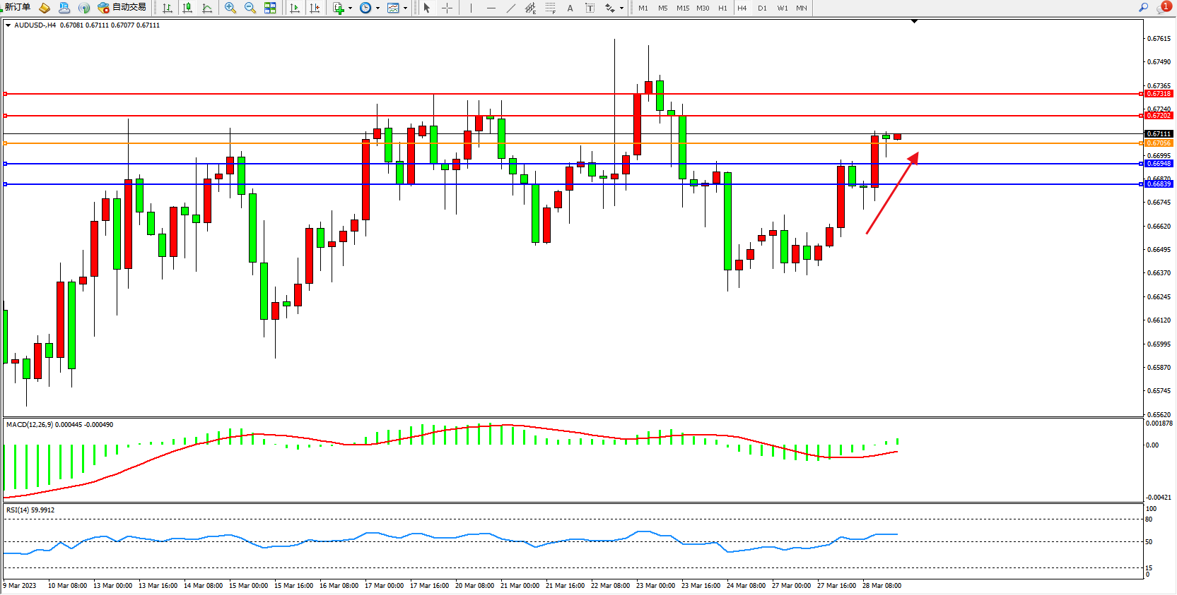 交易策略:0.67056上方看涨,目标0.67202  0.67318