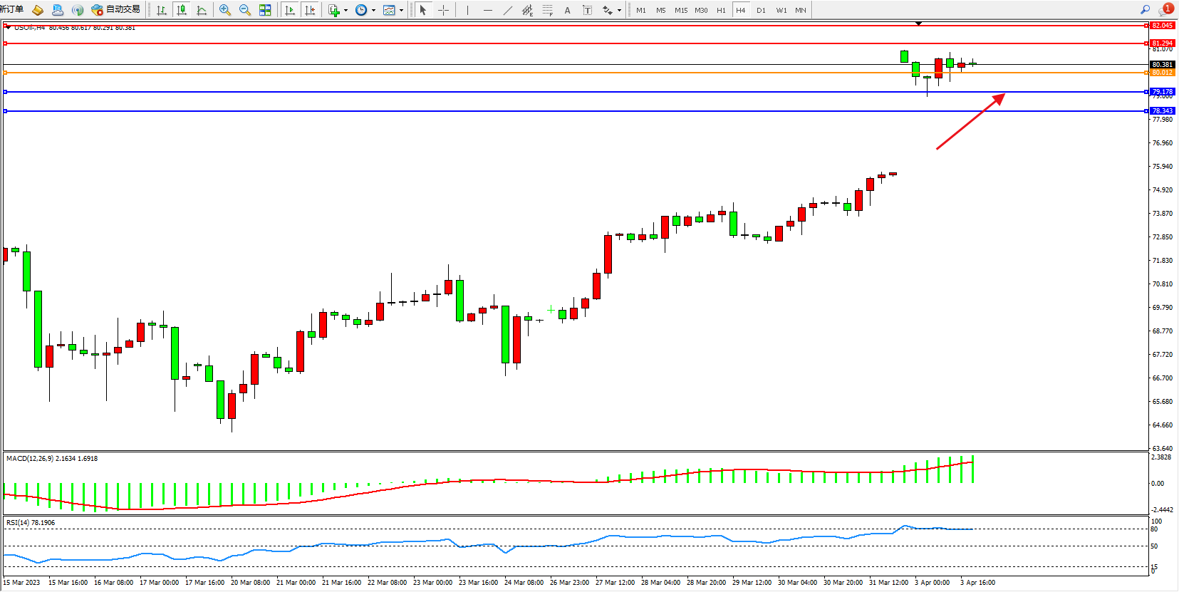 原油USOil——4小时K线图显示: