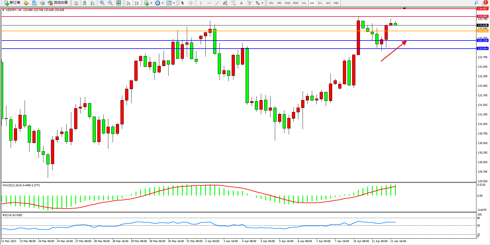 交易策略:133.475上方看涨,目标133.853 134.057