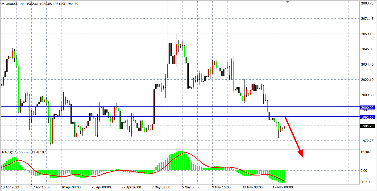 4小时图看,黄金在2000点之下继续走弱,MACD量能在零轴下放量,行情趋势延续下跌,当前阻力下移至1992附近,在该位之下继续看跌1970-1950附近。