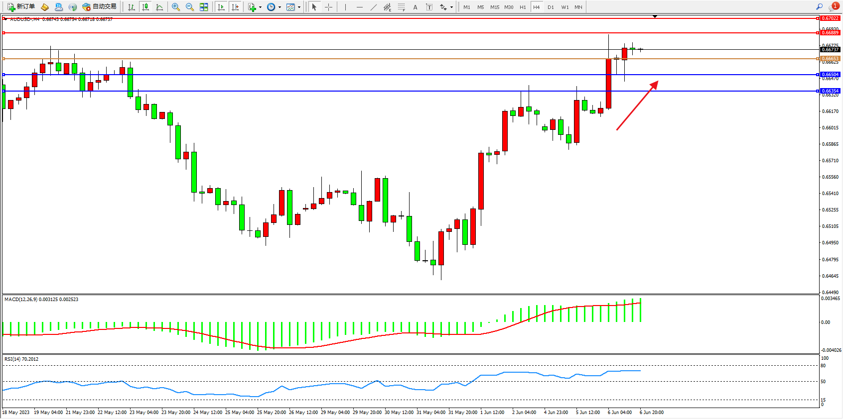 交易策略:0.66653上方看涨,目标0.66889 0.67022