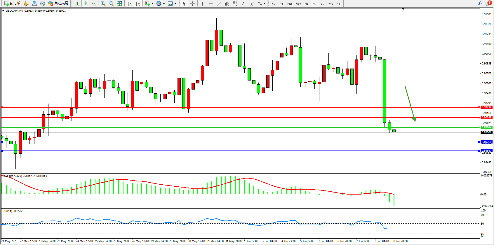 美元瑞郎USDCHF——4小时K线图显示: