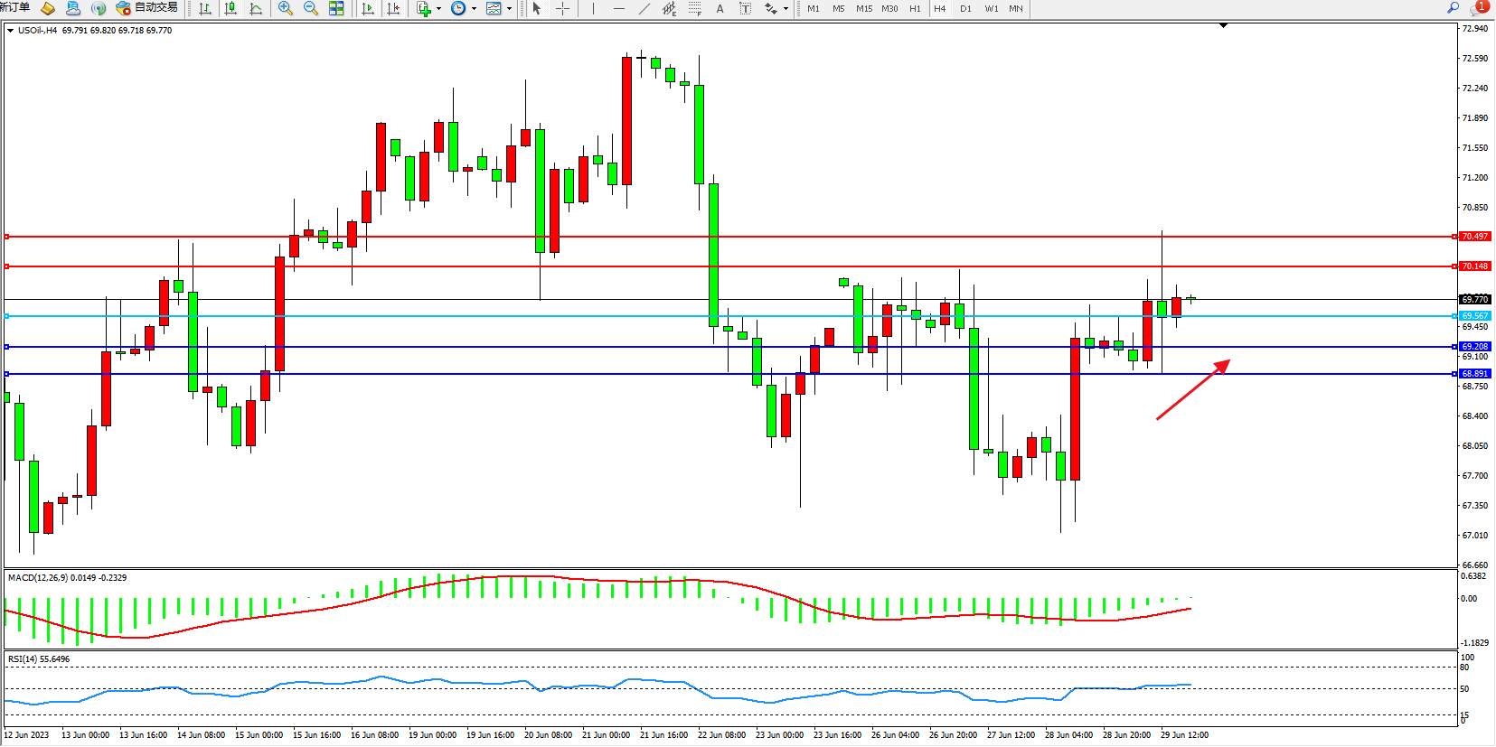交易策略:69.567上方看涨,目标70.148  70.497