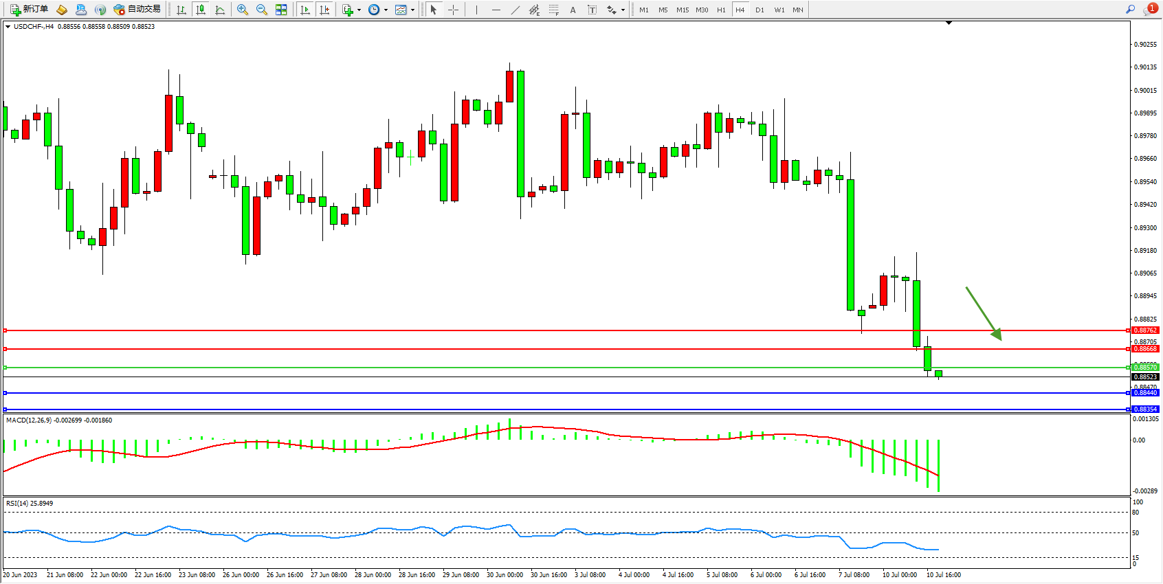 美元瑞郎USDCHF——4小时K线图显示:
