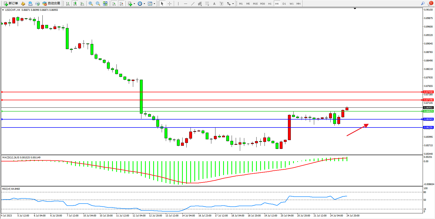 美元瑞郎USDCHF——4小时K线图显示: