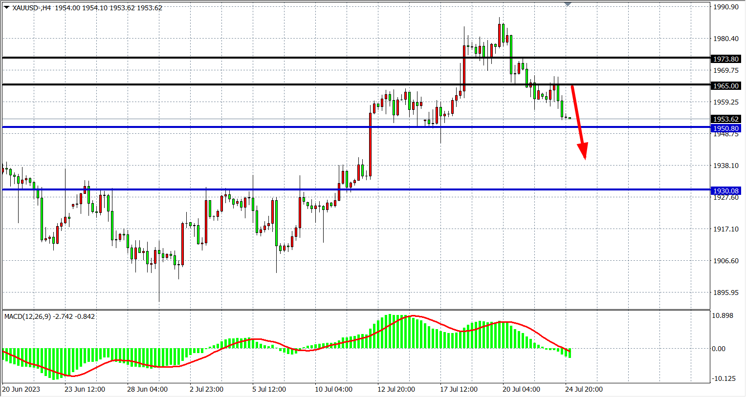 4小时图看,黄金进一步跌破1965,MACD量能下穿零轴,阻力下移至1965-1975,支撑看1950-1930附近。