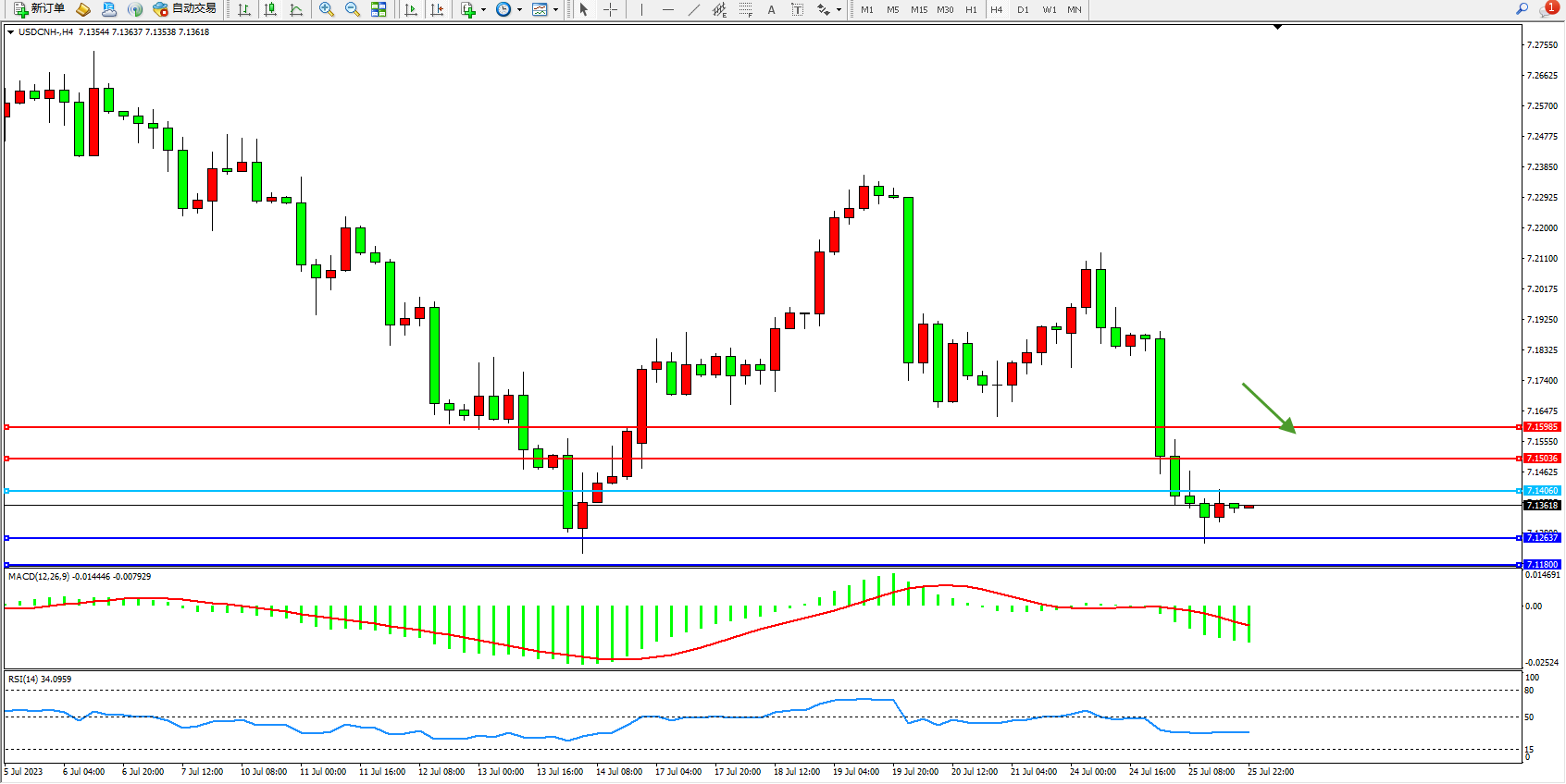 交易策略:7.14060下方看跌,目标7.12637  7.11800