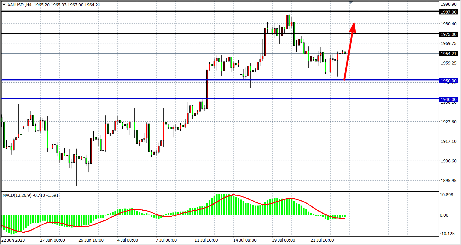 4小时图看,黄金在1950之上止跌回升,MACD量能在零轴下缩量,支撑关注1950-1940,上方阻力1975-1987。