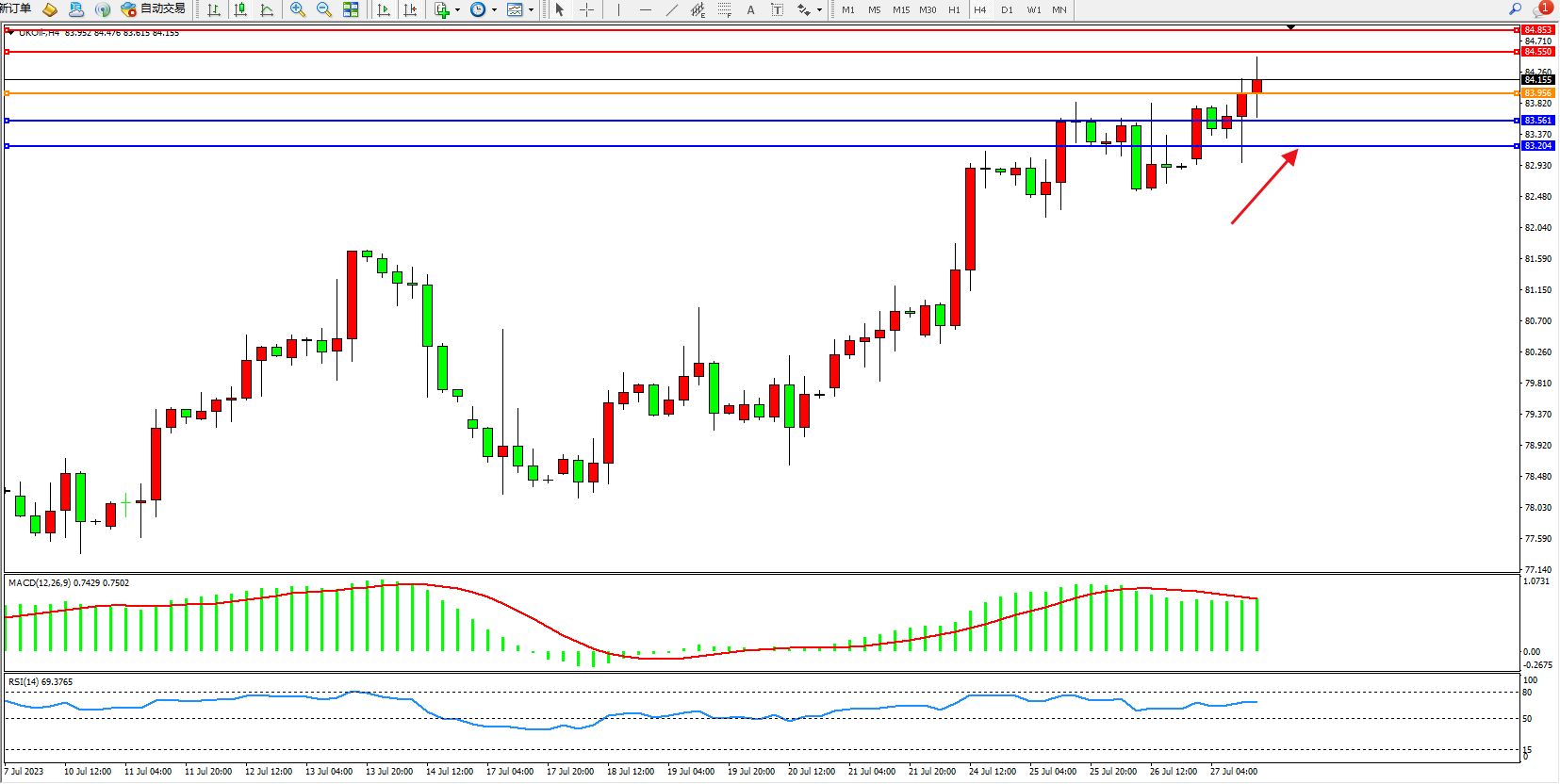 4小时图看:高位多头动力维持震荡向上移动,短期看涨情绪持续,市场多头高位上扬,MACD指标处于兑区域高位整理,RSI指标处于多头区域震荡;