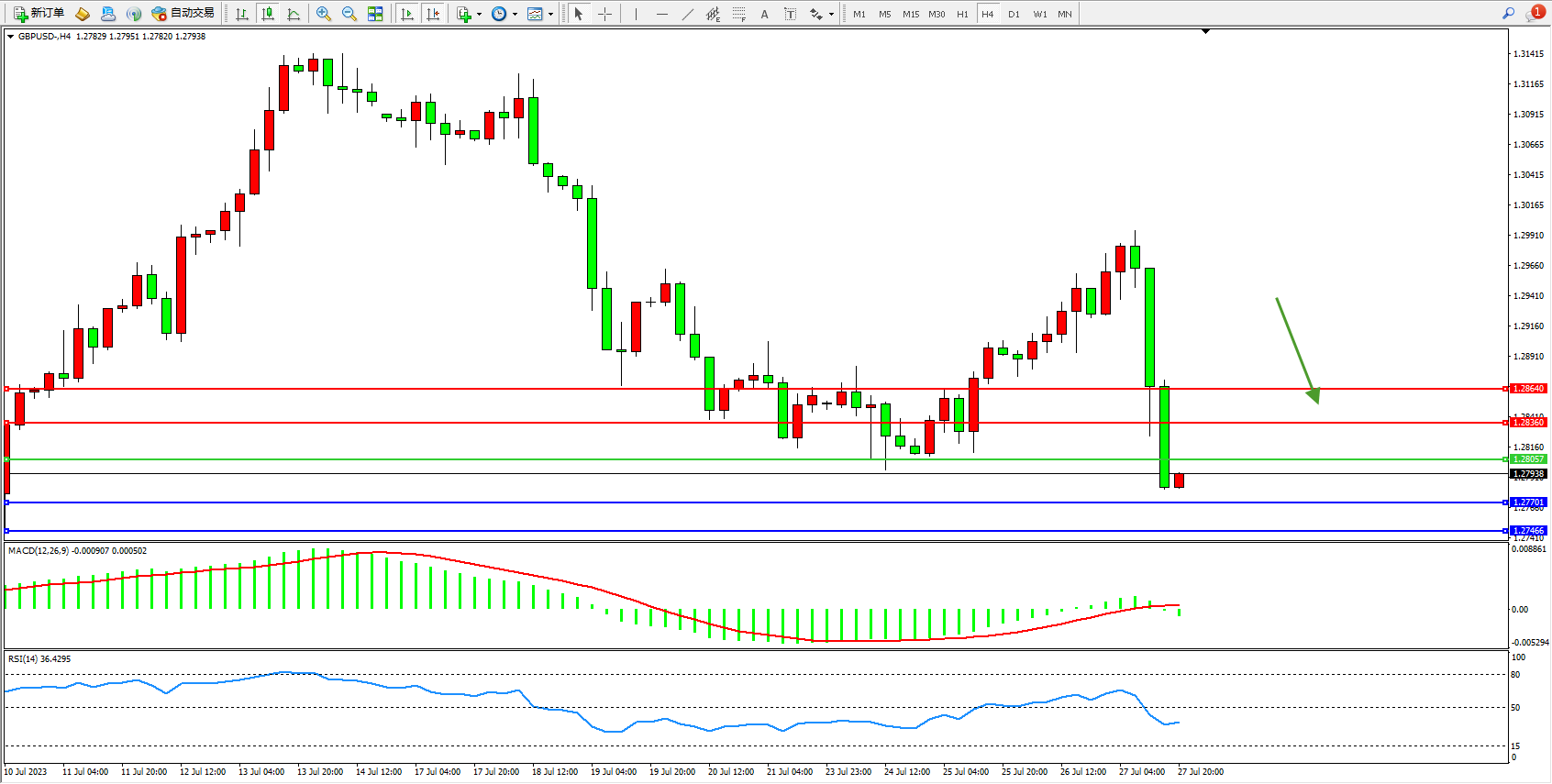 交易策略:1.28057下方看跌,目标1.27701  1.27466