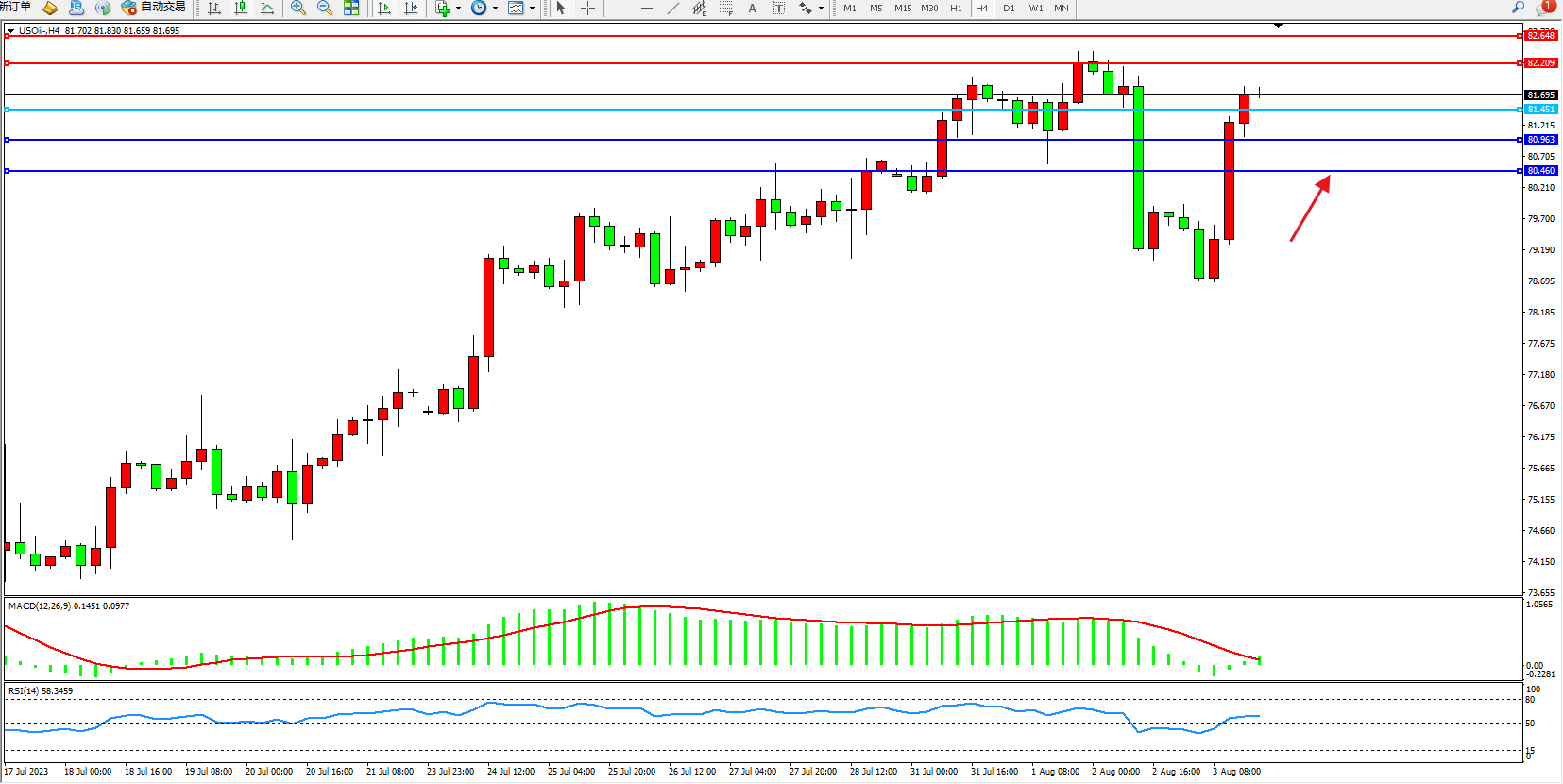 原油USOil——4小时K线图显示: