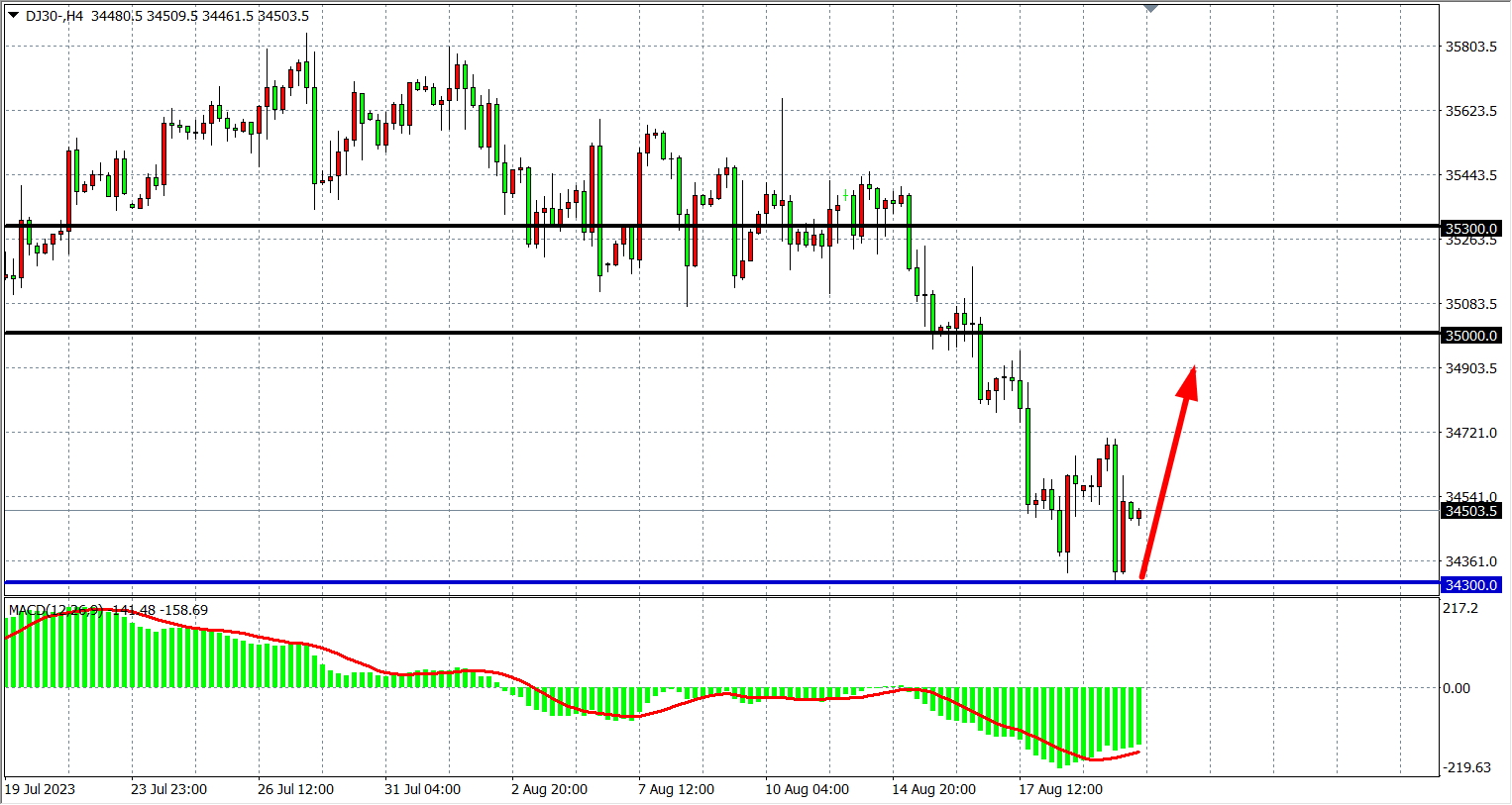 4小时图看,道指在34300一线获得支撑反弹,MACD维持在零轴下,行情出现短暂支撑,关注下方34300一线,阻力依旧关注34780-35000。
