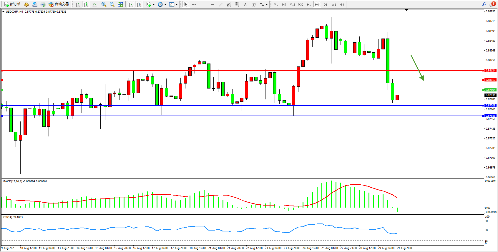 美元瑞郎USDCHF——4小时K线图显示: