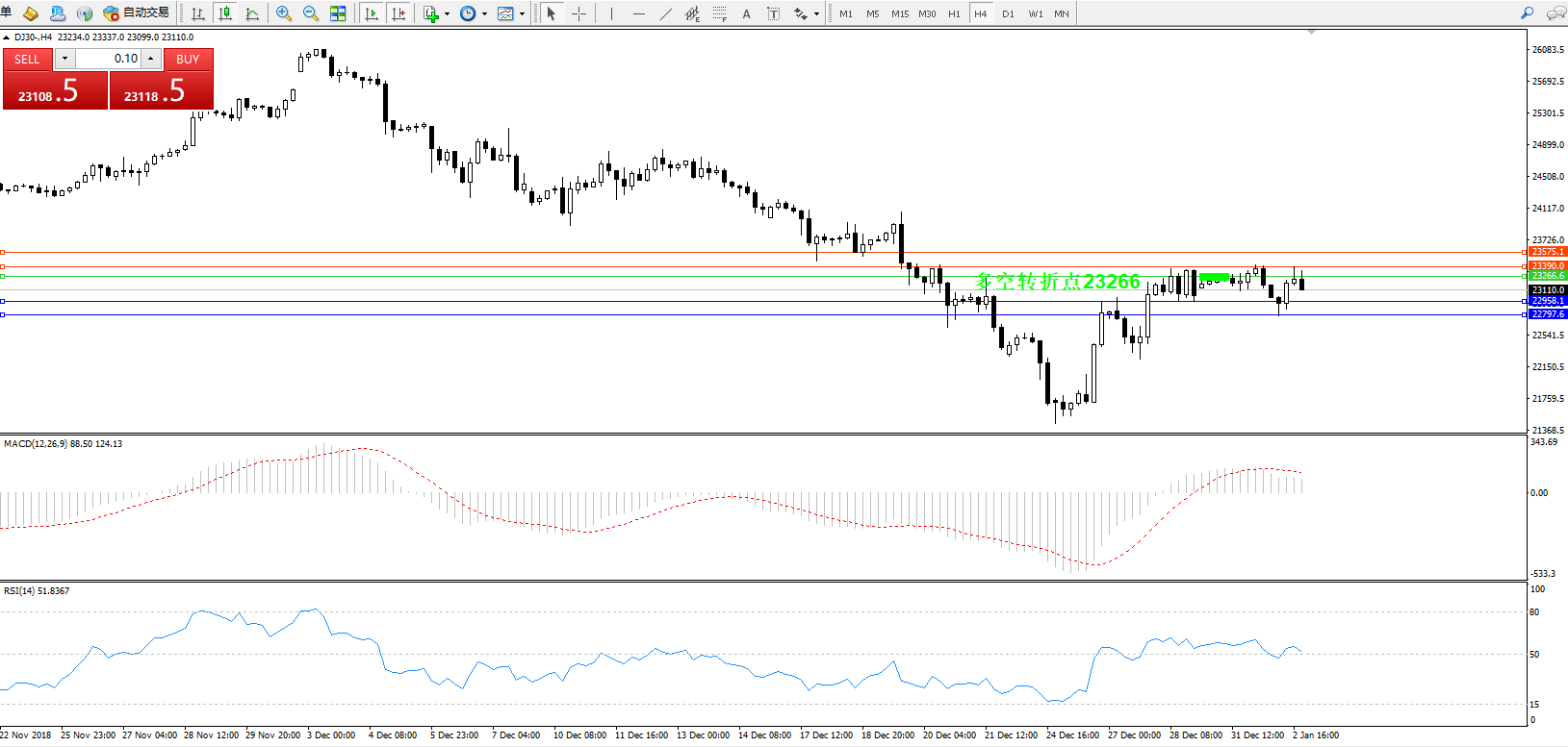 道琼斯指数DJ30—— 4小时K线图显示: