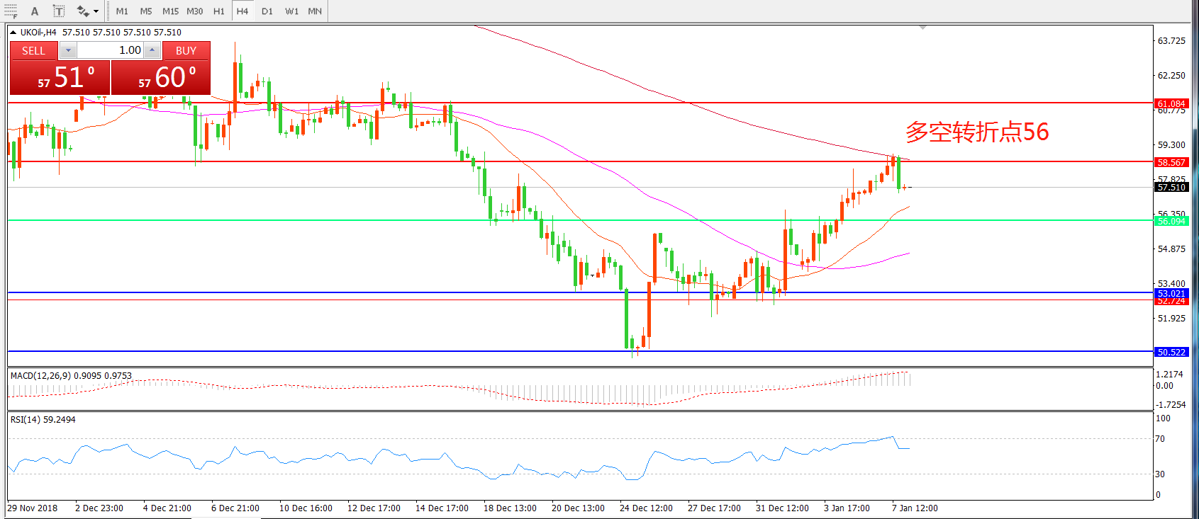 4小时图看,油价站稳56美金后稳步上行, 受200日均线压制小幅下行,MACD红柱增加,RSI指标拐头,短线依然是震荡反弹思路。
