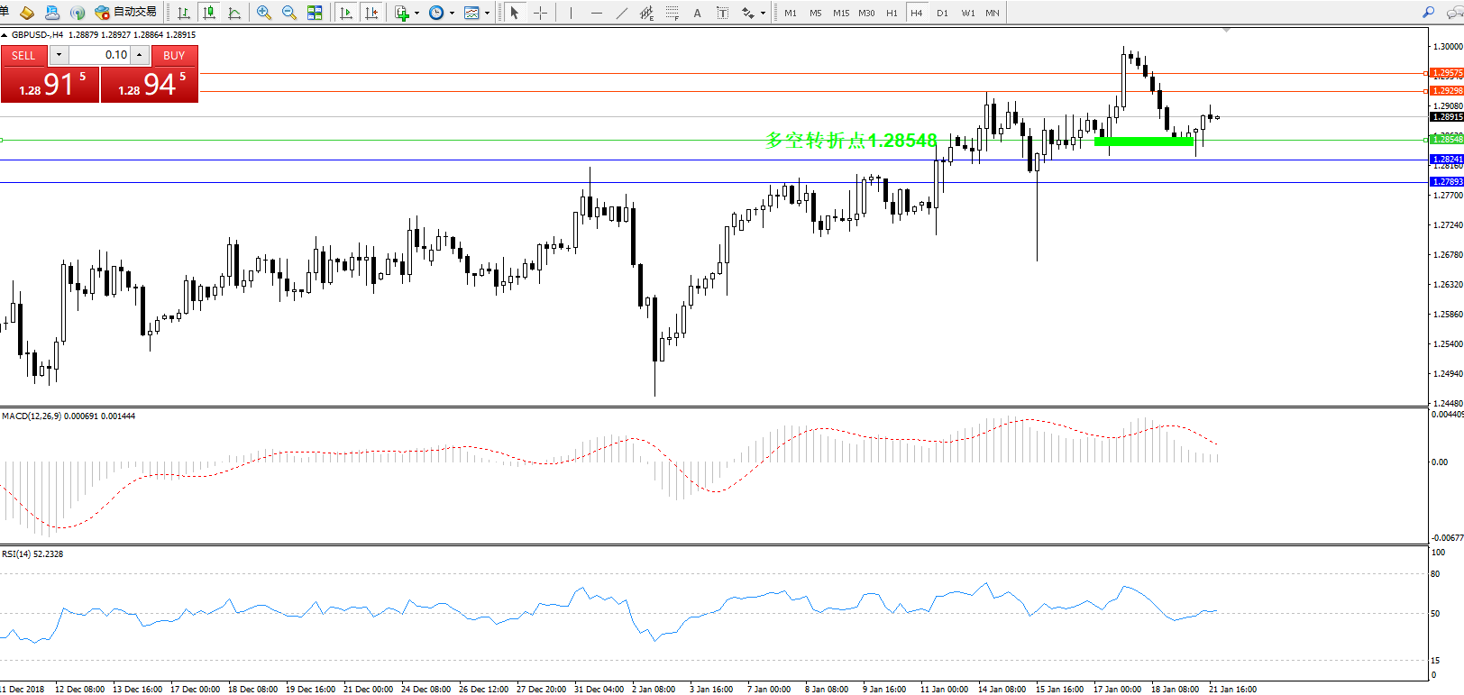 交易策略:1.28548上方看涨,目标1.29298、1.29575