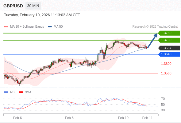 在 1.3640 之上,看涨,目标价位为 1.3700 ,然后为 1.3730 。