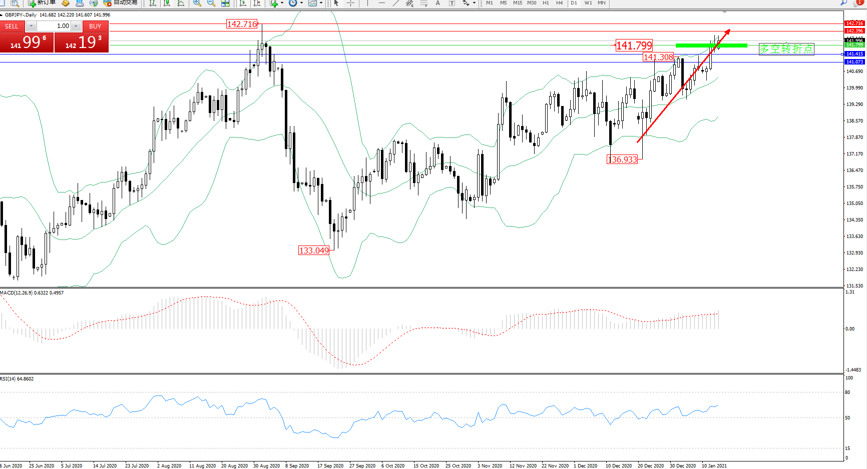 交易策略:141.799上方看涨,目标142.396、142.716