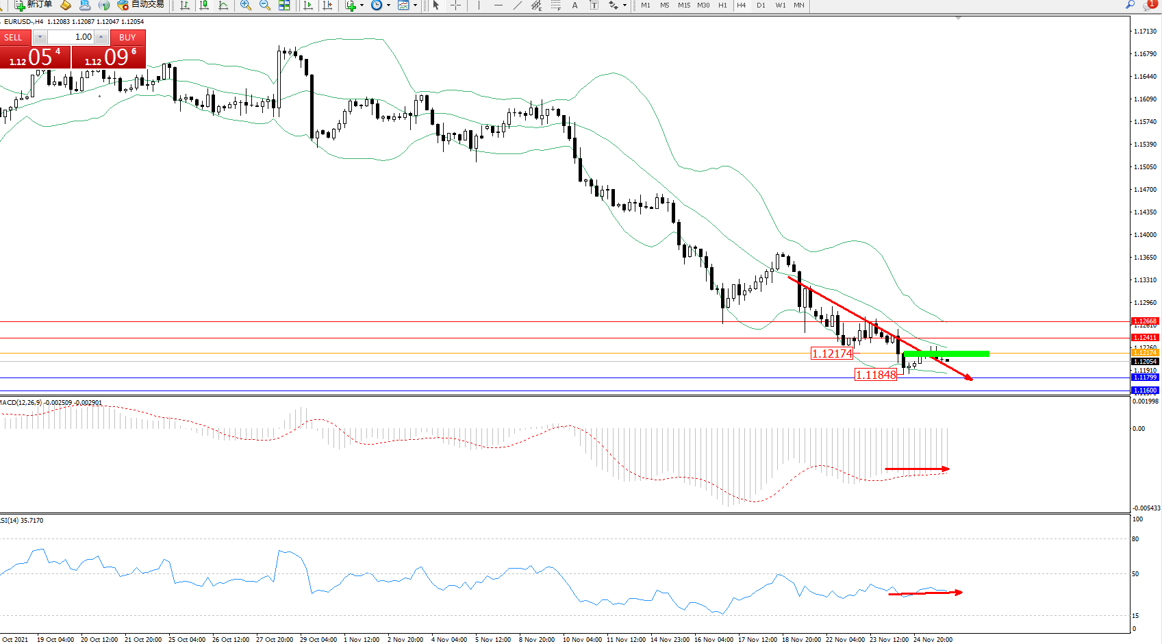 交易策略:1.12174下方看跌,目标1.11799、1.11600