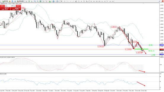 空头动力延续布林带指标通道中下轨区间持续震荡向下移动,低位抵达1.32776位置后得到短暂支撑,但整体跌势未见最终止步,依旧有持续下行态势,布林带指标呈收口走势持续向下移动,MACD指标处于空头区域维持整理平移,RSI指标处于空头区域维持整理缓慢下移,如图: