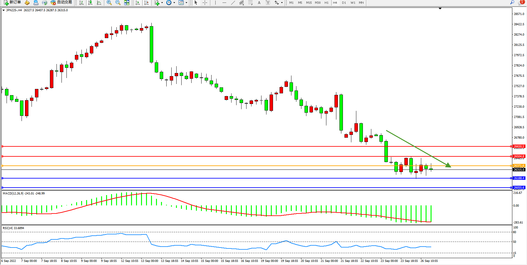 日经225指数9月26日(周一)收盘下跌719.33点,跌幅2.65%,报26434.50点。日本财务大臣铃木俊一:GDP差距不会立即影响经济总量。重要的是要积累一揽子有效的措施。外汇市场的动向取决于多种因素。利率差异并不能决定外汇市场。