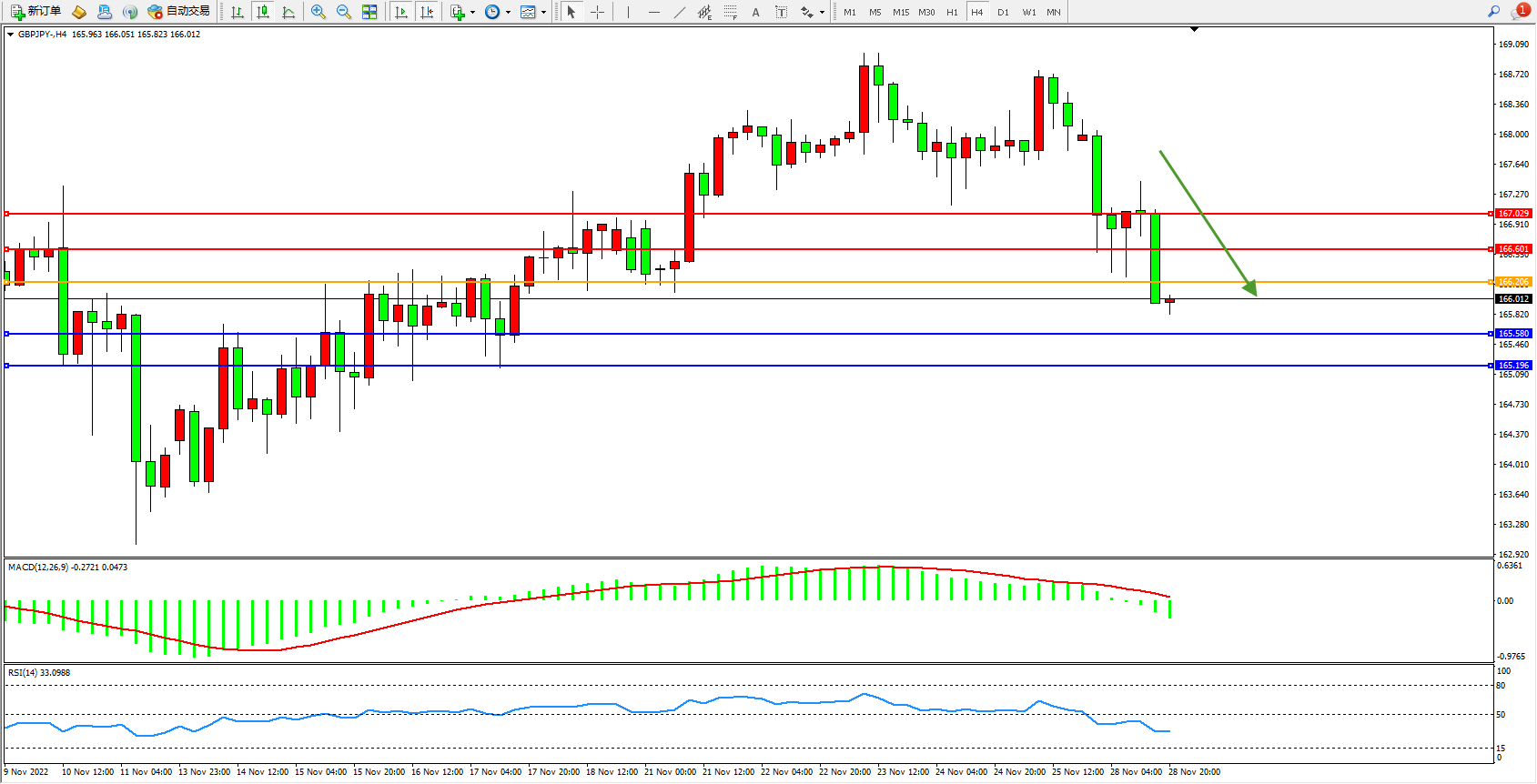 交易策略:166.206下方看跌,目标165.580、165.196
