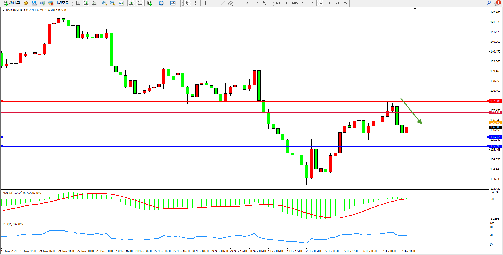 交易策略:136.796下方看跌,目标136.066、135.595
